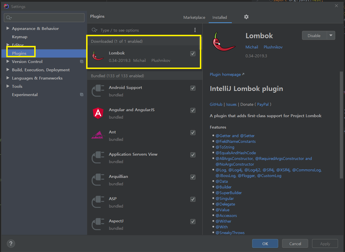 2. lombok ํ๋ฌ๊ทธ์ธ์ ์ค์นํ๋์ง ํ์ธ.