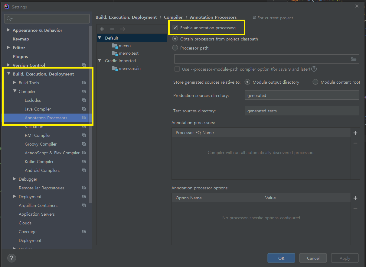 1. intelli J์ Settings์์ annotation processor์ ์ฒดํฌํด ์คฌ๋์ง๋ฅผ ํ์ธ.