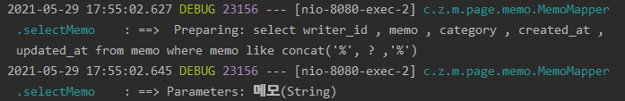 이제 출력결과를 확인하면 아래와 같이 resultSet에 파라미터를 대입한 상태로 출력 됩니다.