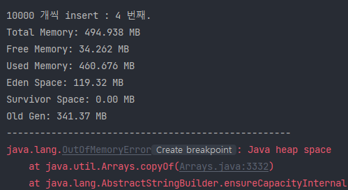 insert가 정상적으로 진행되는 듯 보였으나 5번째 insert에서 또다시 OOM 이 발생했다..